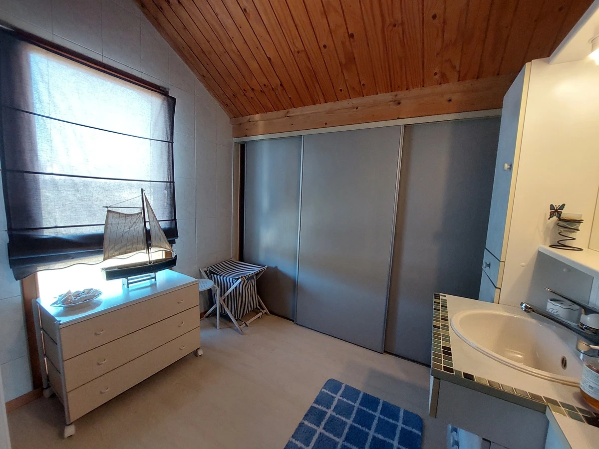 Au rez supérieur, on découvre un séjour avec cheminée, une cuisine ouverte, une chambre, une salle de bain avec baignoire et lavabo et un WC séparé. Depuis la cuisine, il est envisageable de construire un balcon ou une terrasse agrémentée d’une véranda, sous réserve de l’obtention d’un permis de construire